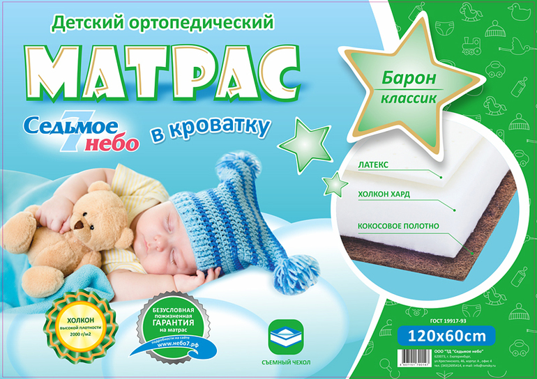 7. Матрас в кроватке фирмы 7 небо, модель Барон классик. Беспружинный, двусторонний - латекс и кокос. Сверху стеганый жаккард. Полностью устраивает. Дата покупки - декабрь 2015 года, ок. 2000 руб.