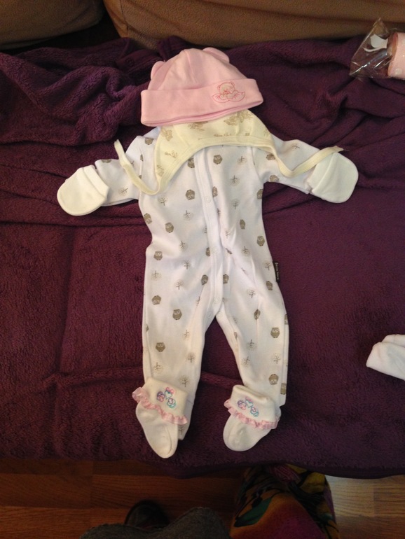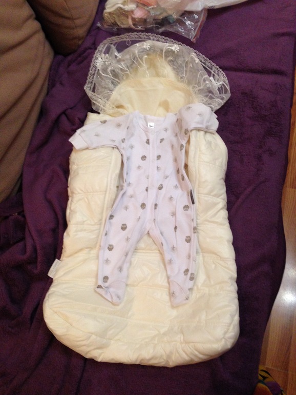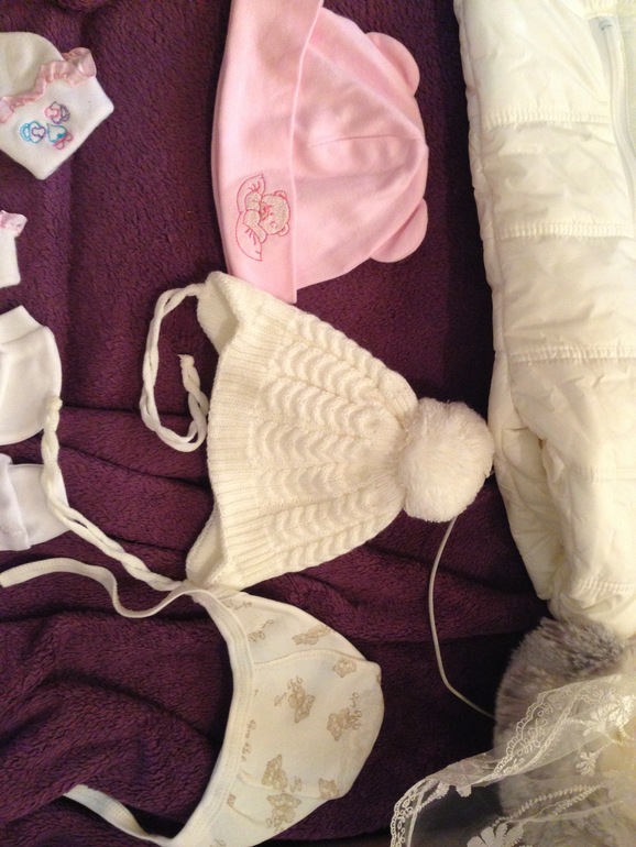 1) Вопрос про шапку - вниз пойдет чепчик хб, а вот сверху два варианта - немного утепленная розовая хб шапочка или вязаная шапочка?