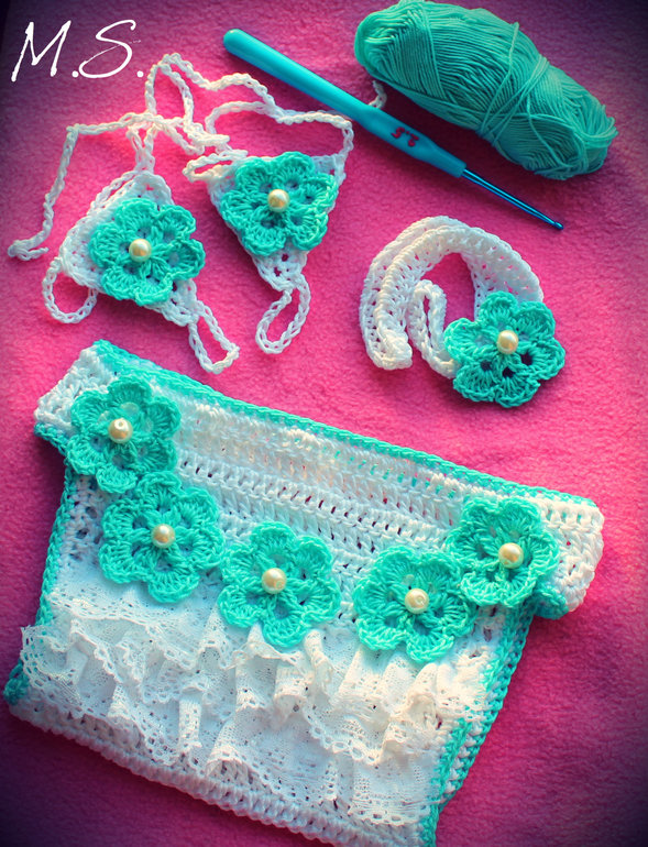 И вот такой нежненький костюмчик(трусики и на памперс(вид сзади),повязка на голову,украшения на ножки)
