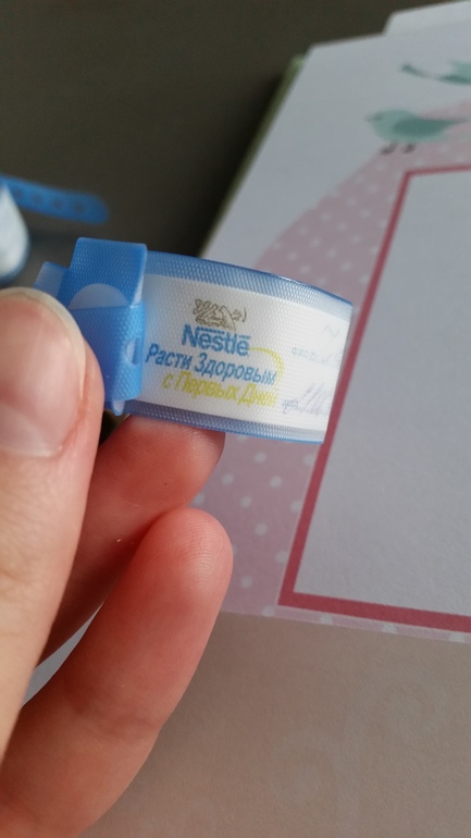 Браслетики на обе ручки. Мальчикам голубые, девочкам розовые. С указанием фио мамы, времени рождения, веса и роста.