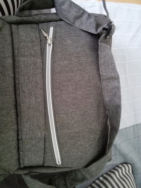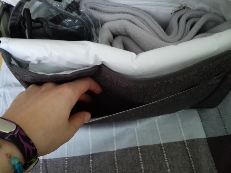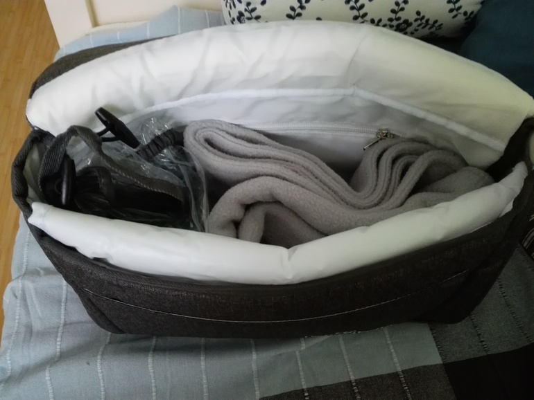Внутри одно отделение. Есть потайной кармашек на молнии. Вот это толстое белое- это клеенка для пеленания в походных условиях (полезная кстати вещь!), серое мятое- след опять. А вон то- прозрачное, дождевик. Долго кстати не могли понять как его одевают;))))) ну, мы начинающие родители. Имхо нам можно тупить;)