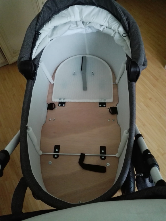 Дно коляски деревянное, что имхо важно, т.к. пластик промерзает и менее экологичен (я за дерево ткань или кожу в качестве донца для колясона). Можно при поднимать изголовье на 3 положения: чёрный шнур. Вернуть как было- серый шнур.
