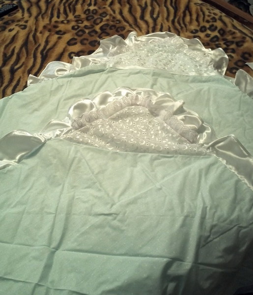 Разворачиваем, состоит из одеяла на синтепоне (вроде) с расшитым уголком и атласным рюшем и бязевой пеленки с таким же уголком и рюшем
