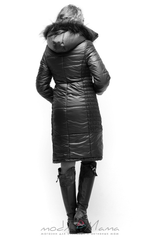 · Куртка классического прямого силуэта длиной 100 см (в размере 44) с натуральным мехом енота на капюшоне.