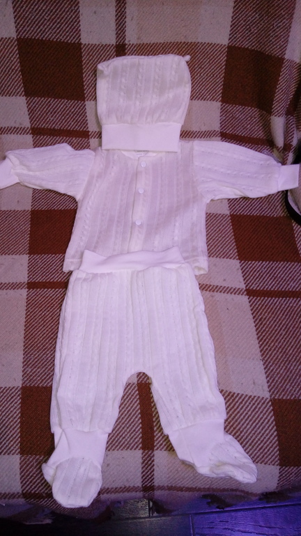 У нас был бодик, штанишки, шапочка (все тоненькое, из одного набора), пинетки-царапки и хлопковое типа одеяльце квадратной формы. Из двух слоёв - хлопкового и тонкой вязаной акриловой ткани. Смотрелось нарядненько)) И ленточкой перевязали в РД покрывальце красиво, аки подарочек)) Жара была кстати неимоверная. Одеялко сняли потом.