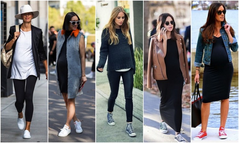 Кроссовки уже давно перешли из разряд обуви для спорта в разряд стильной обуви, поэтому в гардеробе будущем мамы это просто незаменимая вещь. Носите кроссовки, слипоны или кеды с вышеупомянутыми идеальными джинсами, с платьями и юбками - количество стильных комбинаций не сосчитать.