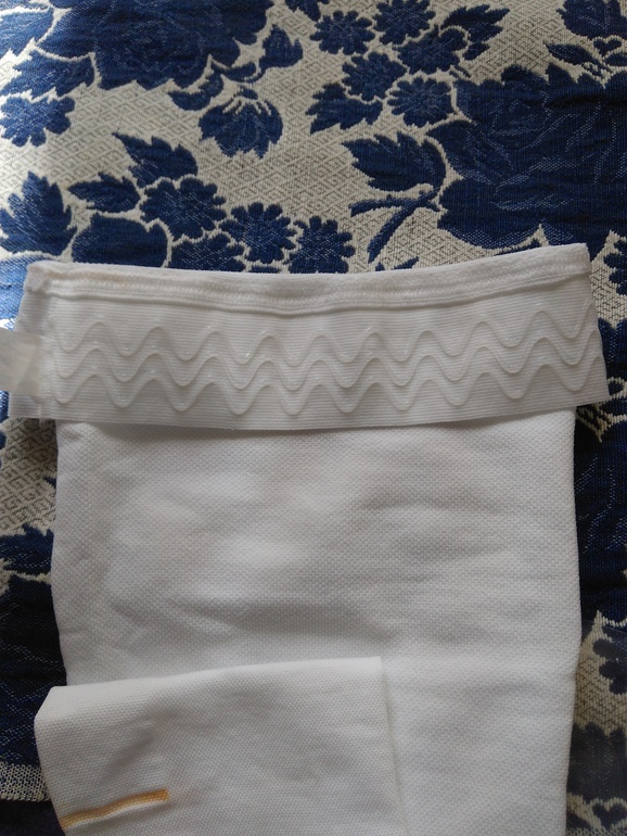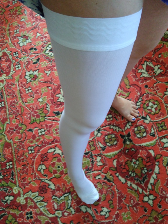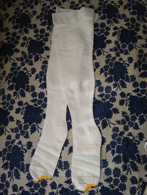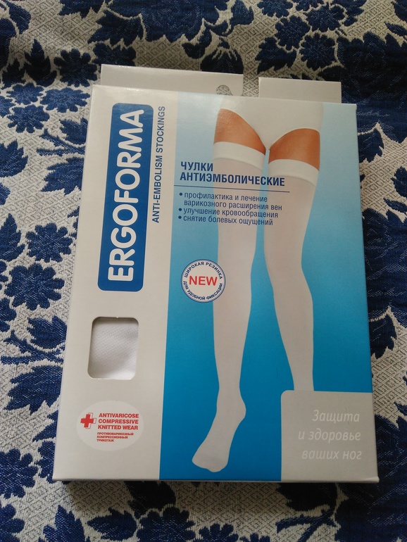 Так же к дополнению к бандажу, в том же магазине, купила антиэмбологические чулки Ergoforma размер*2, второго класса компрессии, белого цвета (был только такой), пр. Италия, цена 1499 р. Консультант настаивала, что после КС нужны именно антиэмбологические, а не просто компрессионные, мол совершенно другая поддержка сосудов и эффективность, я доверилась спецу и купила)