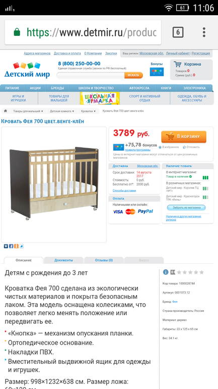 Кроватку Фея 700, мы брали в Детском мире самовывозом, пр. Россия, на тот момент она стоила 4089 р., сейчас как видите дешевле, реального фото и впечатления нет, т.к не собирали по причине ремонта, что бы не пылилась и не мешала.