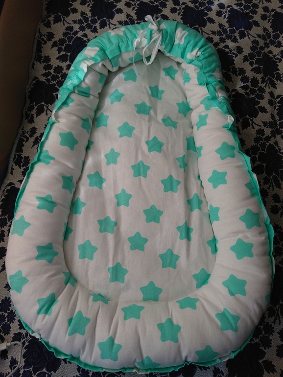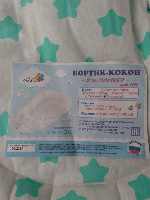 Далее в моем списке идёт бортик-кокон Гнёздышко Alis, 75*45, пр. Россия, приобретен на сайте Акушерство цена 1125 р. Взяла его для первых месяцев, есть мнение, что младенцам первое время лучше и спокойнее спать в ограниченном пространстве, а так же если появиться необходимость укладывать ребенка с собой, можно не боятся за его безопасность. Само Гнёздышко лёгкое и можно стирать в машинке. Мне нравится.