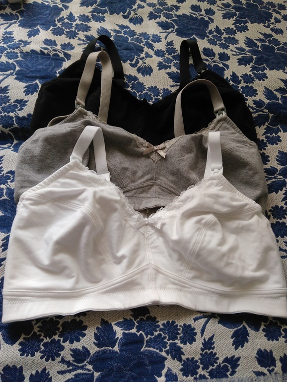 Вот такой набор бюстгальтеров 3 шт, для кормящих я купила на бонприксе, 100%хлопок, размер 85D, размер соответствует размерной сетке продавца, сидит отлично, очень удобный, нигде не жмёт не трёт, сшит добротно. Ссылка на него пропала, цена около 1600 р, и оплата за пересылку около 300р, доставка на почту около 2 недель, всё приблизительно, т.к заказывала их месяца 2 назад и что вспомнила, то и написала, кстати ношу их и сейчас. Рекомендую.