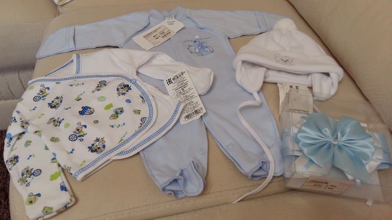 И бантик голубой красивый нашла!Чтоб потом на фото детей отличать.А то в одном комбезе выписываться))