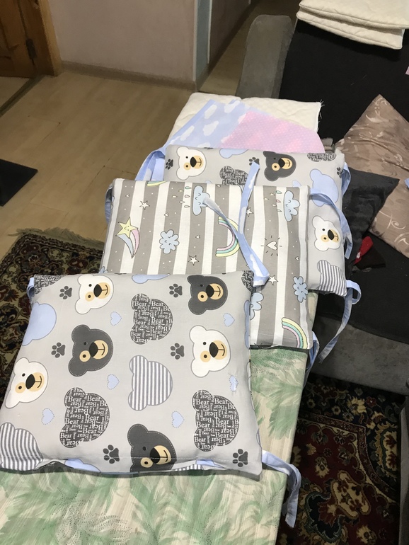 Приданое для малышаНу не получается у меня дружба с трикотажем! Ползунки кособокие, игла от оверлока прорубает дырки, шов тянет, кнопки не хотят вставать на своё место, и вывяливаются.... то ли дело бязь! Не тянется во все стороны, знай, рви по долевой! Ждём не дождёмся когда Папа с средним сыном займутся изготовлением колыбельки для малышки. Они у нас «долго запрягают...» или просто неохото в неотапливаемом гараже мастерить, не знаю. Время у них на раздумья, подбор деревяшек и фанерок есть ещё, пусть думают. Ну а у меня, в руках ЧЕС!!! И работа кипит. Матрасик 100*50 для колыбельки готов, дело за бортиками. Куплено четыре бязевых отрезка по 1,2 метра, и ещё бракованный остаток с облачками из которых в итоге вышло 4 простыни 1*1,2 и набор подушек 30*30 см. Подушки - чехлы, внутри, лоскутные отрезы строчёных одеял, купленные на вес( промотходы) себестоимость вышла: подушки и матрасик270 рублей, и бязь 600 рублей, а да!!! Горсть старых пуговиц и все!