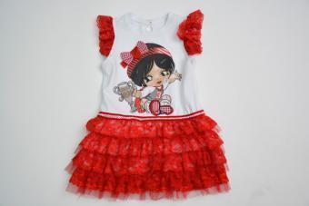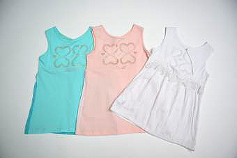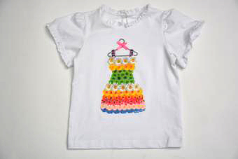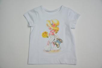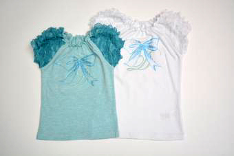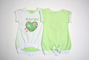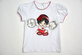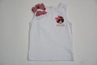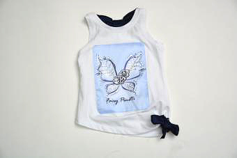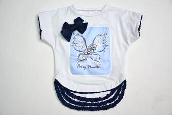 143N Майка. Модель украшена декоративным бантом с оборками, изображением девочки и названием бренда из страз.