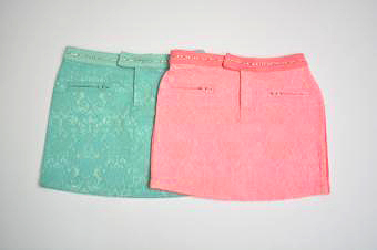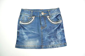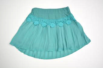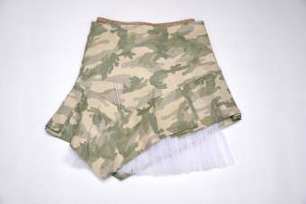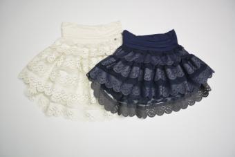 35N Юбка. Модель с рюшами средней длины, выполнена из чередования узорной ткани и искусственной кожи с перфорацией. Цвета: молочный и синий