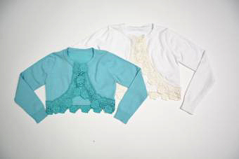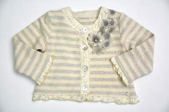 159) Кардиган. Изделие в орнаментную полоску, края изделия украшены узорной тканью. Декоративные цветы в верхней части изделия.