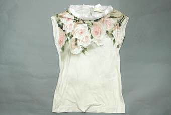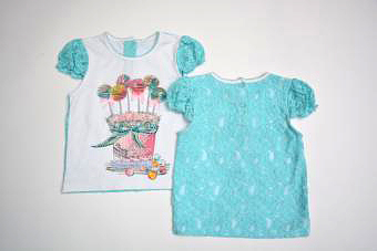 176) Футболка. Модель с рукавами из кружевной ткани. Верхняя часть изделия украшена декоративными цветами.
