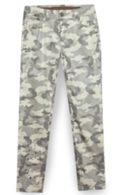 160) Брюки. Модель с декоративными элементами из узорной ткани на карманах и нижней части изделия. На поясе расположен бант с необработаными краями