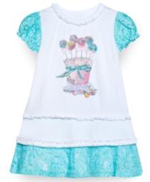 203) Платье. Орнаментный принт горошек и полоска по всему изделию и изображение пирожных на юбке. Модель украшена декоративным бантом в области пояса и драпировкой на юбке. В нижней части принта в названии бренда допущена небольшая ошибка.