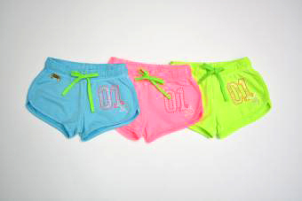 08) Шорты. Модель спортивного стиля украшена рисунком со стразами. Небольшой логотип в верхней части. Пояс декорирован шнуровкой.