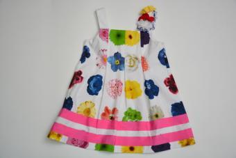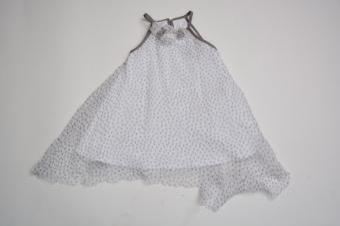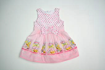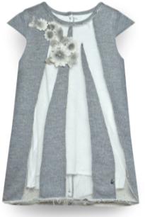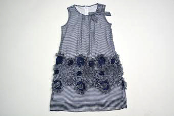 33) Платье. Модель без рукавов, декорирована объёмными цветами и бантом. Верх изделия выполнен из шифоновой ткани с полосатым принтом.