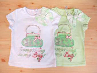 263) Футболка. Модель с коротким рукавом. Оригинальный принт с изображеним сумки, украшен бусинами и стразами. Декоративный бант на вороте изделия.
