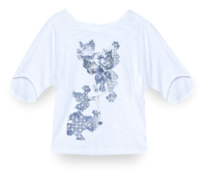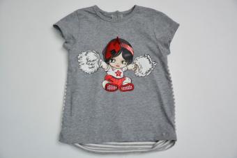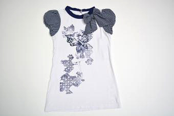 178) Футболка. Рукава и спинка изделия декорированы узорной тканью. Оригинальный принт украшен небольшими бантиками и стразами.