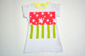 35) Удлиненная футболка. Полосатые рукава фонарики и декоративный бант выполнены из шифоновой ткани. Круглый вырез отделан бейкой из другой ткани с застёжкой сзади. Принт украшен стразами.