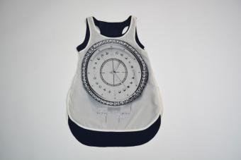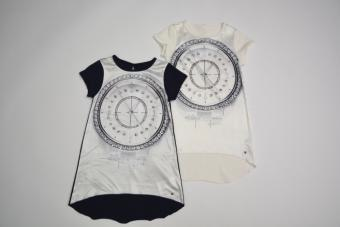 66) Туника. Внутренняя и внешняя часть изделия выполнены в контрастных цветах. Модель украшена оригинальным принтом "Часы" со стразами.