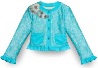 123N Пиджак. Модель с накладными карманами выполнена из узорной ткани, с оборками по низу и на манжетах, и украшена контрастными декоративными цветами в верхней части.