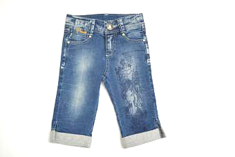 143) Капри. На ткань нанесён принт с изображением феи. Задние карманы украшены стразами. Низ изделия с небольшими разрезами.