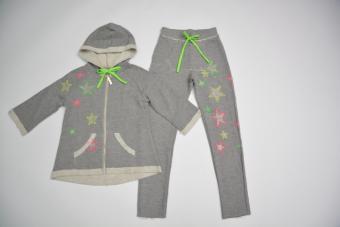 15N Спортивный костюм. Джемпер свободного кроя на молнии с контрастными шнурками на капюшоне и накладными карманами. Брюки с необработанным низом с контрастными шнурками на поясе и накладным карманом.