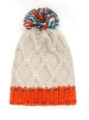 Шапка трёхцветная с помпоном из цветных ниток. Выполнена в декоративной вязке. Нижняя часть модели оранжевого цвета с прострочкой голубыми нитками. одинарная вязка 65%-хлопок,35%-акрилл