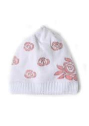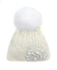 Шапка для девочки белого цвета выполнена декоративной вязкой. С белым помпоном из натурального меха. С переди модель украшена объёмным декоративным орнаментом в форме цветов, украшенных стразами. на подкладе (хлопок) 70%-шерсть, 30%-хлопок