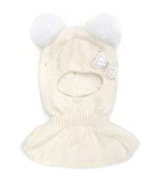 Шапка - "шлем", для девочки, молочного цвета, с двумя помпонами. Спереди модель украшена декоративным элементом в форме бабочки. на подкладе (синтепон) 70%-шерсть, 30%-хлопок