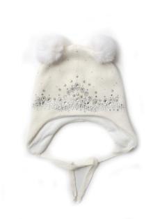 Шапка для девочки молочного цвета, на завязках, с двумя белыми помпонами из натурального меха. Передняя часть модели декорированна орнаментом из крупных камней и страз. на подкладе (синтепон) 70%-шерсть, 30%-хлопок