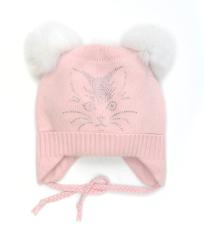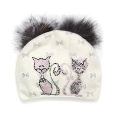 Шапка для девочек молочного цвета. С двумя пушистыми помпонами из натурального меха. Аппликация в виде кошечек из мелких страз. двойная вязка 70%-шерсть, 30%-хлопок