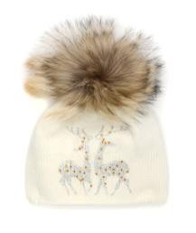 Шапка для девочек с пушистым натуральным меховым помпоном. Выполнена в нежном молочном цвете с орнаментом двух оленей и с россыпью мелких страз. двойная вязка 70%-шерсть, 30%-хлопок