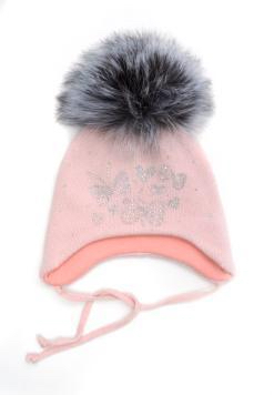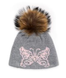 Шапка для девочек серого цвета. На лобовой части изображена декоротивная бабачка нежного розого цвета с натуральным меховым помпоном. на подкладе (синтепон) 65%-шерсть,35%-хлопок