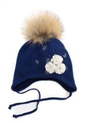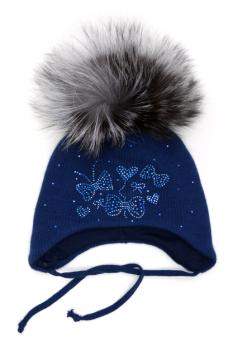 Шапка для девочки василькового (синего) цвета, на завязках с помпоном из натурального меха. Пепредняя часть модели декорирована арнаментом в форме бантов из страз. на подкладе (синтепон) 65%-шерсть,35%-хлопок