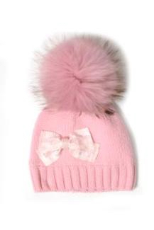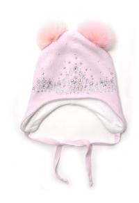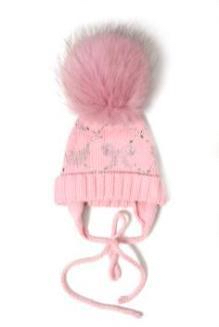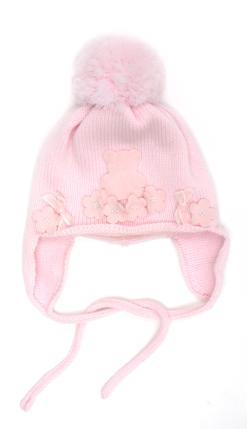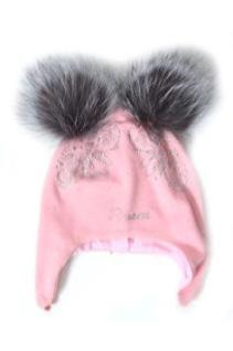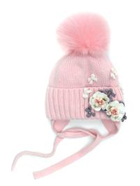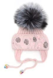 Шапка для девочки на завязках розового цвета, с помпоном из натурального меха. На подвороте модели декоративные элементы из страз. двойная вязка 70%-шерсть, 30%-хлопок