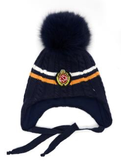 Шапка для мальчика, синего цвета, на завязках, с помпоном из натурального меха. Шапка выполнена декоративной вязкой. Поперёк модели - 2 полосы жёлтого и белого цветов. По центру - логотип. на подкладе ( синтепон) 65%-шерсть,35%-хлопок
