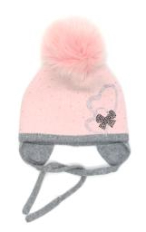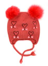 Шапка для девочки розового цвета с завязками, с помпоном из натурального меха. Передняя часть модели украшена декоративными элементами в форме сердечек и банта из страз. двойная вязка 65%-шерсть,35%-хлопок
