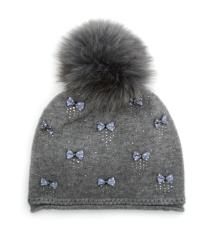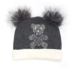 Шапка для девочки, серого цвета с серым помпоном из натурального меха. Поверхность шапки декорированна бантиками и мелкими стразами. двойная вязка 70%-шерсть, 30%-хлопок