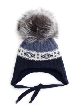 Шапка для мальчика, синего цвета, на завязках с помпоном из натурального меха. Модель выполнена декоративной вязкой. Поперёк модели - белая полоса с орнаментом. на подклаже (синтепон) 70%-шерсть, 30%-хлопок
