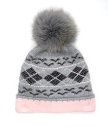 Шапка для девочек серого и светло-розового цвета с орнаментом в виде цветов и пушистым помпоном из натурального меха. двойная вязка 65%-шерсть,35%-хлопок