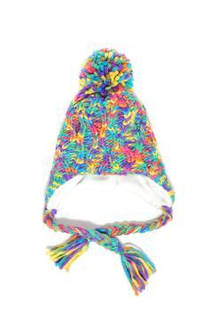 Шапка разноцветная с помпоном из цветных ниток. Выполнена в крупной вязке. Завязки в форме косичек. одинарня вязка,на флисовом подкладе 65%-хлопок,35%-акрилл