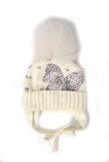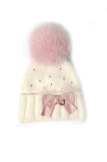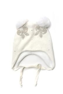 Шапка для девочки молочного цвета на завязках, с двумя белыми помпонами из натурального меха. Передняя часть модели декорированна бантами из искусственных камней и россыпью страз. на подкладе (синтепон) 65%-шерсть,35%-хлопок