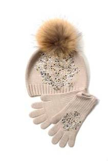Комплект для девочки бежевого цвета: шапка с помпоном из натурального меха, с переди модель декорированна арнаментом из цветных страз. Перчатки - декорированны орнаментом из цветных страз. Шарф с помпонами из натурального меха. одинарная вязка 70%-шерсть, 30%-хлопок