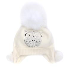 Шапка для девочки молочного цвета на завязках, с белым помпоном из натурального меха. На передней части модели декоративный элемент в форме совы из страз. двойная вязка 70%-шерсть, 30%-хлопок
