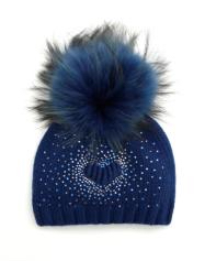 Шапка для девочки синего цвета с синим помпоном из натурального меха. С переди на шапке выполнен орнамент из страз в форме сердца. одинарная вязка 65%-шерсть,35%-хлопок